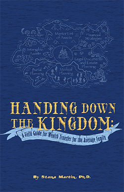 Stana MartinThis book lays out a “map” of a person’s “kingdom” (aka assets) and gives a step-by-step guide to legal documents, planning and arrangements that need to be done to insure the kingdom does not slip into the hands of others. There are six main areas of a person’s “kingdom:” Master List of Assets, Financial Strategies, Legal Documents and Estate Planning, Medical Planning, Burial Planning, and Intangible Assets. There is a chapter on each section as well as worksheets to help you identify next steps in handing down your kingdom to your heirs. If you want to leave an inheritance, or maybe just have things arranged so it is easy for your children, this book is a must read.